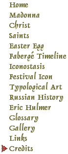 Home |  Madonna |  Saints |  Christ |  Easter Egg |  Fabergé Timeline |  Russian History |  Eric Hulmer |  Iconostasis |  Festival Icon |  Typological Art |  Gallery |  Glossary |  Links |  Credits